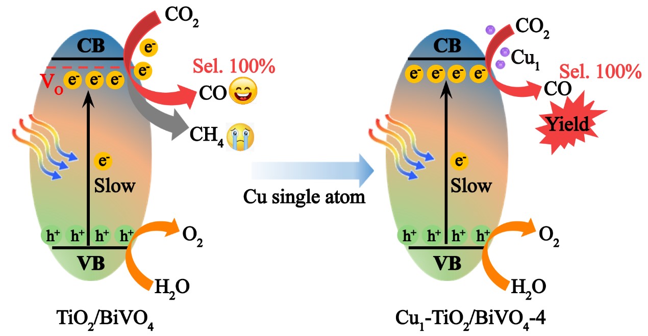 Z-或S-型异质结催化剂可通过加速电子传递提升CO2的转化效率,但在生成2电子产物CO的同时不可避免的生成8电子产物CH4。该研究团队提出通过减慢电子传递速率提升CO2还原产物选择性的反应策略。研究发现,增加TiO2组分可以减慢Ӏ型异质结TiO2/BiVO4的电子传输速率,当TiO2与BiVO4的摩尔比为4时,实现了CO2向CO的100%选择性转化。在此基础上,研究团队进一步构建了负载Cu单原子TiO2/BiVO4催化剂,在保持100%选择性的情况下将CO产率提升了3.83倍。机制研究揭示CO的100%选择性主要得益于载体TiO2/BiVO4-4的低速电子传输,而Cu单原子则通过吸附活化CO2提升了CO产率。这种将异质结与单原子耦合的两步调控策略,实现了还原产物CO的选择性和产率同步提高,有望解决光催化还原CO2生成的C1/C2+产物一直面临的低选择性和低产率问题。