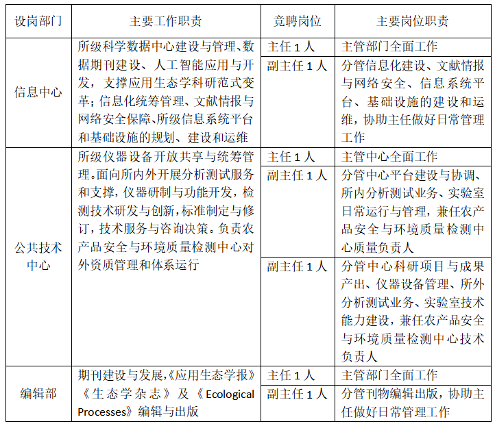 按照研究所工作安排,依据《中国科学院沈阳应用生态研究所中层领导人员选拔聘用和管理实施细则》(科应生所字〔2017〕21号),现面向所内在编职工采用竞聘上岗方式招聘管理部门中层领导人员及相关职能部门领导人员。
