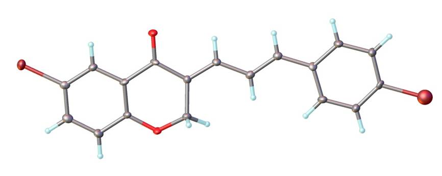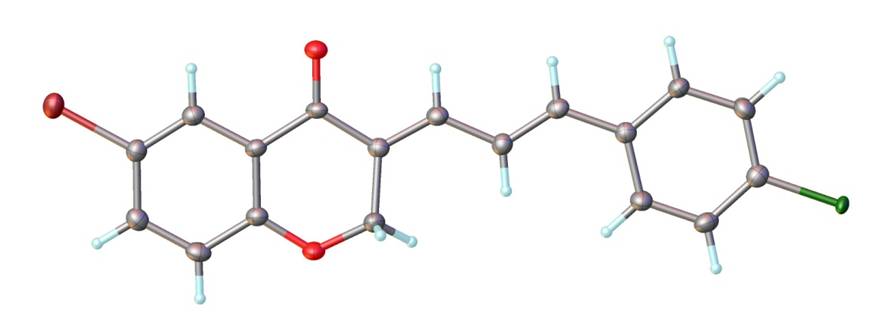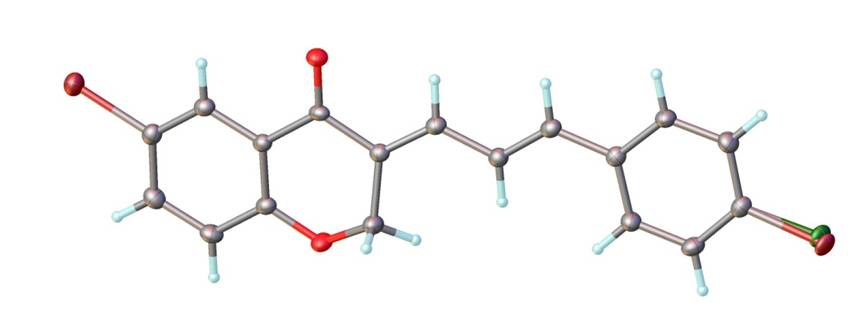 图1. 模型1的化合物结构图,其中灰色原子代表C,浅蓝色原子代表H,亮红色原子代表O,左上方的深红色原子代表Br,右下方的绿色原子代表Cl。